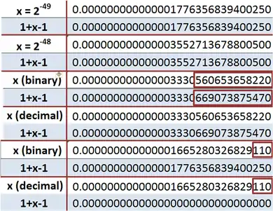The last two examples illustrate what happens if x is a rather small number. In the second from last example, x = 1.110111⋯111 × 2−50 ; 15 bits altogether. The binary is replaced very crudely by a single power of 2 (in this example, 2−49) and its decimal equivalent is used. In the bottom example, a decimal identical with the binary above to the precision shown, is nonetheless approximated differently from the binary, and is eliminated by truncation to 15 significant figures, making no contribution to 1 + x − 1 , leading to x = 0 .[lower-alpha 2]