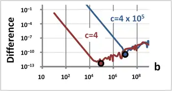 In the figure, Excel is used to find the smallest root of the quadratic equation x2 + bx + c = 0 for c = 4 and c = 4 × 105. The difference between direct evaluation using the quadratic formula and the approximation described above for widely spaced roots is plotted vs. b. Initially the difference between the methods declines because the widely spaced root method becomes more accurate at larger b-values. However, beyond some b-value the difference increases because the quadratic formula (good for smaller b-values) becomes worse due to round-off, while the widely spaced root method (good for large b-values) continues to improve. The point to switch methods is indicated by large dots, and is larger for larger c-values. At large b-values, the upward sloping curve is Excel's round-off error in the quadratic formula, whose erratic behavior causes the curves to squiggle.