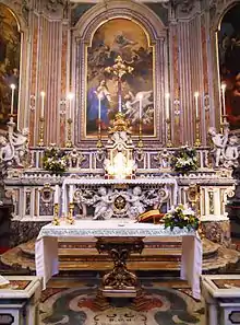 Parisi, in his reforms, changed the site from the buildings and convents of the Panatica Palace to the site of the Jesuit novitiate of Pizzofalcone. The complex was built thanks to the generous donations of noblewomen Anna Mendoza, Marchioness della Valle and Countess of Sant'Angelo dei Lombardi,[5] and Delia Sanseverino, Countess of Briatico.[5] The donation was 19,500 ducats, divided in twelve years.[6] The novitiate was opened on 8 September 1587, and had greeted the seminarians previously housed the novitiate of Nola.[7] Along with the former seminary, they were granted an architectural jewel of the Neapolitan Baroque, the attached Church of the Nunziatella, so called to distinguish it from the larger Basilica of the Santissima Annunziata. Built in 1588, the church had been heavily remodeled in 1736 by the Ferdinando Sanfelice; and embellished with frescoes by Francesco De Mura, Paolo De Matteis, Ludovico Mazzanti and Pacecco De Rosa, as well as the splendid altar built by Giuseppe Sammartino.[8][9][10]