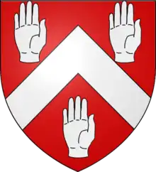 - Arms: Gules a chevron between three dexter hands couped at the wrist Argent.