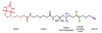 Other methodologies have been developed for quantitative profiling of O-GlcNAc using differential isotopic labeling.[50] Example probes generally consist of a biotin affinity tag, a cleavable linker (acid- or photo-cleavable), a heavy or light isotopic tag, and an alkyne.[51][52]
