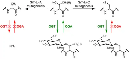 Site-directed mutagenesis of O-GlcNAc-modified serine or threonine residues to alanine may be used to evaluate the function of O-GlcNAc at specific residues. As alanine's side chain is a methyl group and is thus not able to act as an O-GlcNAc site, this mutation effectively permanently removes O-GlcNAc at a specific residue. While serine/threonine phosphorylation may be modeled by mutagenesis to aspartate or glutamate, which have negatively charged carboxylate side chains, none of the 20 canonical amino acids sufficiently recapitulate the properties of O-GlcNAc.[60] Mutagenesis to tryptophan has been used to mimic the steric bulk of O-GlcNAc, though tryptophan is much more hydrophobic than O-GlcNAc.[61][62] Mutagenesis may also perturb other post-translational modifications, e.g., if a serine is alternatively phosphorylated or O-GlcNAcylated, alanine mutagenesis permanently eliminates the possibilities of both phosphorylation and O-GlcNAcylation.