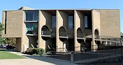 The Oak Park Village Hall at 123 Madison Street is the center of village government in Oak Park, Illinois. The village hall was built in 1975 as part of a series of public infrastructure improvements intended to prevent white flight from the village. In the late 1960s, as more black residents moved to the east side of Oak Park, preexisting white residents began deinvesting in the neighborhood and moving away. The village responded by investing heavily in the east side and adopting housing policies which discouraged blockbusting and resegregation, ultimately causing the village to become diverse and integrated. The new village hall was a key piece of this plan, as it brought a landmark building to a vulnerable section of the east side. Harry Weese, a nationally prominent Chicago architect, designed the Modernist building. The building's design includes a brick exterior with a ribbon window along the roof line, an enclosed central courtyard, and a triangular council chamber section with a long front ramp threaded through several brick pylons.[2]