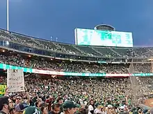 In response to the team's planned relocation to Las Vegas, Athletics fans would hold a protest during the team's April 28 home game against the Reds, holding up signs that read "Sell", "Stay", "#FisherOut", "Kaval=Liar" and "Sell the Team" with the latter chanted in the stands along with "Stay in Oakland" (the same phrase used by Oakland Raiders fans urging the team to remain in Oakland prior to the team's move to Las Vegas). Controversially, the official MLB broadcast of the game cropped out these signs leading the league to apologize, "We were unaware of the edit. When it came to our attention, we corrected it as it isn't consistent with our policy" said a spokesperson.[51][52]