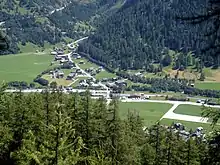 The next settlement up the Rhone valley is Obergesteln, which is located on a terminal moraine of the Rhone glacier in the Rhone valley, at an elevation of 1,353 m (4,439 ft). Obergesteln is overlooked by the mountains of the Sidelhorn, to the north, and the Pizzo Gallina, to the south.[7]