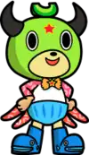 Obira's mascot is Obimaru (おびまる) who is a curious and kind heart superhero that resembles a bull. Legend has it that this figure was formed from a bull, a melon, an octopus, two scallops, two fishes and a rice bowl on August 12, 2014. No one knows its gender yet. It can eat anything that is locally produced especially melon, beef, octopus, scallops, herring and rice. His charm point is a red star on his forehead to show its status has mascot of the town.[3]