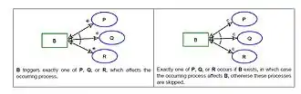 - Control link, which is a procedural (transforming or enabling) link with a control modifier—the letter e (for event) or c (for condition), which adds semantics of a control element. The letter e signifies an event for triggering the linked process, while the letter c signifies a condition for execution of the linked process, or connection of two processes denoting invocation, or exception.