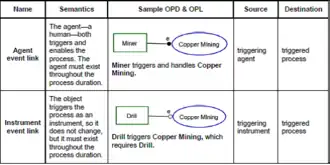 - Enabling link, which connects an enabler (an object that enables the process occurrence but is not transformed by that process) or its state, to a process, which enables the occurrence of that process.