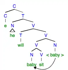 One highly influential syntactic account for NI is the head movement process proposed by Baker (1988).[11] This account states that this NI head movement is distinct from but similar to the better-established phenomenon of phrase movement and involves the movement of a head noun out of object position and into a position where it adjoins to a governing verb. An example of this movement can be seen in figure 1 where the head noun 'baby' is moved out of the object N position to become incorporated with the verb as the sister to the verb 'sit'. While this theory does not account for every language, it does provide a starting point for subsequent syntactic analyses of NI, both with and without head movement. A more recent paper by Baker (2007) addresses a number of other influential accounts including Massam’s pseudo-incorporation,[12] Van Geenhoven’s base generation,[13] and Koopman and Szabolcsi’s small phrase movement.[14][15] It was concluded that while each have their strong points, they all fail to answer some important questions, thus requiring the continued use of Baker's head movement account.[15]