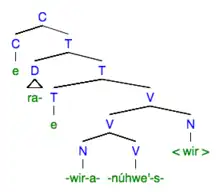 Baker, Aranovich, & Golluscio claim that the structure of NI in Mohawk is the result of noun movement in the syntax.[9] This is an extension of Baker's head movement hypothesis[15] which is described above. The differences that Mohawk displays as compared to other languages therefore depends on whether or not the person, number, and gender features are retained in the ‘trace’ of the noun, the trace being the position from where the noun moved from object position before adjoinig to the governing verb.[9] Figure 2 illustrates a simplified syntax tree of noun incorporation in Mohawk following Baker's head movement hypothesis. Here, the noun -wir- (baby) is moved from the object N position to become incorporated with the verb as the sister to the verb -núhwe'- (to like). Please note that some details were not included in this tree for illustrative purposes.