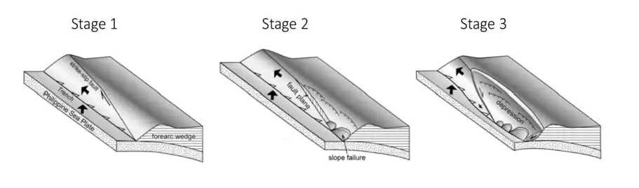 In the plate boundary, an approximately 80 km long and 30 km wide depression is observed.[11] It obscures trench parallel strike slip fault and the topographic ridge of the wedge.[11]