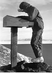 The search party returned to their base camp in McMurdo Sound to await the relief ship. After it arrived, they worked to build a memorial – a nine-foot wooden cross, inscribed with the names of the fatal party and the final line of the Alfred Tennyson poem "Ulysses", which reads "To strive, to seek, to find, and not to yield." On 22 January 1913, after a difficult two-day sledge journey, the cross was erected on the summit of Observation Hill, overlooking the camp and facing out towards the "Barrier" – the Ross Ice Shelf, on which Scott's party had died.[2] In 1972, the cross was declared as one of the initial Historic Sites and Monuments in Antarctica by the Antarctic Treaty signatories, as HSM-20.[3][4]