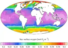 - ↑ Garcia, H.E.; Locarnini, R.A.; Boyer, T.P.; Antonov, J.I. (2006). Levitus, S. (ed.). World Ocean Atlas 2005, Volume 3: Dissolved Oxygen, Apparent Oxygen Utilization, and Oxygen Saturation. Washington, D.C: NOAA Atlas NESDIS 63, U.S. Government Printing Office. p. 342.