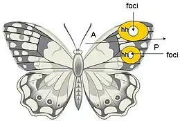 Butterfly eyespots are formed during embryogenesis as a result of a morphogenetic signalling centre or organizer, called the focus. This induces neighbouring cells to produce specific pigments which pattern the eyespot.[22][23][24]