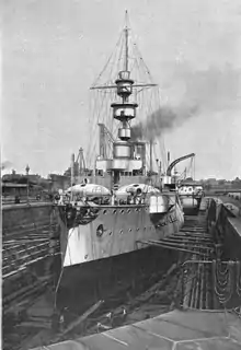 The ships' primary armament consisted of three 24-centimeter (9.4 in) K L/35 guns.[5] In an arrangement that was very unusual for such large guns, two of the guns were mounted in a pair of MPL C/88 barbettes forward side-by-side, while the third was mounted in a single barbette aft. The guns could train 150 degrees to either side of the centerline, and depress to -4 degrees and elevate to 25 degrees. This enabled a maximum range of 13,000 m (14,000 yd).[6] The guns had an ammunition storage of 174 rounds, or 58 shells per gun.[5] The guns had a rate of fire of around 2 shells per minute. The 1895 design for the armor-piercing shell weighed 140 kg (310 lb).[6]