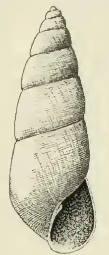 The shell is very elongate-conic, yellowish-white. It measures 5.6 mm. The small nuclear whorls are immersed in the first of the succeeding turns, above which only half of the last volution projects. The seven post-nuclear whorls are situated high between the sutures. They are appressed at the summit and slightly rounded. They are marked by feeble lines of growth, and many sub-equal and subequally spaced, strongly incised, spiral lines. About 25 of these occur between the sutures of the fourth whorl and about 30 between the summit and the periphery on the penultimate turn. The sutures are strongly impressed. The periphery of the body whorl is somewhat angulated. The base of the shell is well rounded, moderately long, marked like the spire. The aperture is elongate-oval, slightly effuse anteriorly. The posterior angle is acute. The thin outer lip is decidedly sinuous, bent back at the posterior angle to almost form a notch. The inner lip is moderately long, oblique, slightly curved and slightly revolute, provided with a strong fold at its insertion. The parietal wall glazed with a thin callus.[3]