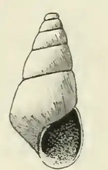 The shell is small, measuring 3.1 mm. It is regularly conic, bluish-white. The nuclear whorls are deeply and obliquely immersed in the first of the succeeding turns, above which only the tilted edge of the last volution projects. The 5½ post-nuclear whorls are slightly rounded. They are marked by fine retractive lines of growth and numerous fine, spiral striations. The sutures are strongly impressed. The periphery of the body whorl is subangulated. The base of the shell is rather short, sloping from the subangulated periphery to its anterior margin, with a tumid area bounding the narrow umbihcus, marked like the spire. The aperture is oval. The posterior angle is acute. The outer lip is thin. The inner lip is decidedly curved and reflected. The columella is provided with a strong oblique fold at its insertion. The parietal wall is glazed with a moderately thick callus.[3]