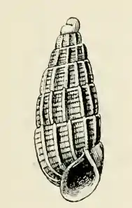 The small shell is elongate-conic, rather stout and semitranslucent. The nuclear whorls are small, two and one-half, forming: a depressed helicoid spire, whose axis is at right angles to that of the succeeding turns, in the first of which it is about one-fourth immersed. Post-nuclear whorls are flattened, moderately contracted at the sutures and slightly shouldered at the summit, marked by very strong, lamellar, somewhat retractive axial ribs, of which 14 occur upon all of the whorls. The termination of these ribs form cusps at the summits. Intercostal spaces are four times as wide as the ribs, marked by six equal and equally spaced incised lines, the space between the summit and the first line below it appearing as a thickened cord. The sutures are well impressed. The periphery of the body whorl and base is well rounded, marked by the strong continuation of the axial ribs and about five incised spiral lines. The aperture is ovate. The posterior angle is acute. The outer lip is thin, showing the external sculpture within. The columella is stout, slightly curved and somewhat r volute. The parietal wall is covered by a very strong callus.[3]