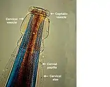 Both sexes of adults have a cephalic inflation and an oral opening lined with both internal and external leaf crowns.[6] Female adults, which have a length range of 6.5–24 mm, are generally larger than their male counterparts, with a length range of 6–16.6 mm. Males can be distinguished by their bell-like copulatory bursa, located in the tail, and their paired rodlike spicules.[9]