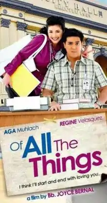 Of All the Things is a 2012 Philippine romantic-comedy film starring Regine Velasquez and Aga Muhlach. The film was produced by GMA Pictures and VIVA Films. It was released on September 26, 2012. This film is Regine and Aga's third team-up after Dahil May Isang Ikaw (1999) and Pangako Ikaw Lang (2001), both produced by Viva Films.