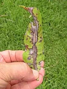O. mangiferae leaf spots and leaf curling on mango leaves