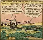 During the late 1950s and early 1960s a number of American painters began to adapt the imagery and motifs of comic strips. Lichtenstein made drawings of comic strip characters in 1958. Andy Warhol produced his earliest paintings using this style in 1960. Lichtenstein, unaware of Warhol's work, produced Look Mickey and Popeye in 1961.[1] Soon, Lichtenstein advanced from animated cartoons to more serious themes such as romance and combat depictions.[2] Lichtenstein said that at the time, "I was very excited about, and very interested in, the highly emotional content yet detached impersonal handling of love, hate, war, etc., in these cartoon images."[2] The work was inspired by five different comic book panels made by Russ Heath and Irv Novick.[3] The plane, the pilot, the text balloon and the graphic onomatopoeia, "VOOMP!", all come from panels from different comic books.[4]