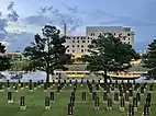 Residents of Oklahoma City suffered substantial losses on April 19, 1995, when Timothy McVeigh detonated a bomb in front of the Murrah building. The building was destroyed (the remnants of which had to be imploded in a controlled demolition later that year), more than 100 nearby buildings suffered severe damage, and 168 people were killed.[29] The site has been commemorated as the Oklahoma City National Memorial and Museum.[30] Since its opening in 2000, over three million people have visited. Every year on April 19, survivors, families, and friends return to the memorial to read the names of each person lost. McVeigh was executed by lethal injection on June 11, 2001.