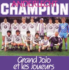 In 1985, Hans Kusters, the head of Belgian music label Hans Kusters Music, asked producer Roland Verlooven and the Belgian singer Grand Jojo (Jules Jean Van Obbergen) to write a song for the Belgian football team R.S.C. Anderlecht who were the league champions in the 1984–85 season.[18][19] Verlooven (also known as Armath) and Van Obbergen wrote the song called "Anderlecht Champion" at Grand Jojo's home in Groot-Bijgaarden, and it was recorded both in French and Dutch by Grand Jojo with the players of Anderlecht including the manager Paul Van Himst. The chorus has the line "Allez, Allez, Allez, Allez/We are the champions, we are the champions" in French and English.[12] The song was released that year by Disques Vogue.[20]