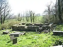The ruins of St Gwenllwyfo's Church stand near Dulas, in the north-east of Anglesey, Wales. The date of construction of the first church on the site is unknown. There was a church here in medieval times: one 19th-century writer suggested that the present building dates from the 15th century and that the font, probably 12th century in date, was the only surviving part of an earlier church on the site.[1] Restoration work was carried out in about 1610 and in the 18th century; the latter changes eradicated the church's historical details.[1][2][3]