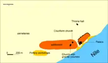 About 1.5 km to the north-east of the citadel lies the so-called Kom H where the monastery was uncovered. According to the inscription it is dedicated to St Anthony the Great but the Monastery of the Holy Trinity is also referred to in literature.[3] It was probably one of the first Christian building projects in Dongola.[4] Archbishop of Dongola, Georgios, who died in 1113, was buried in one of the crypts in the church. The inscription on his funerary stela indicates that St Anthony the Great was the patron of the monastery.[3] In the rich assemblage of texts in Greek, Coptic, and Old Nubian found in the archbishop's crypt,[1] a dedication to the Holy Trinity also appears.[3]