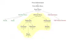 Old East Slavic (traditionally also Old Russian)[lower-alpha 1] was a language (or a group of dialects) used by the East Slavs from the 7th or 8th century to the 13th or 14th century,[3] until it diverged into the Russian and Ruthenian languages.[4] Ruthenian eventually evolved into the Belarusian, Rusyn, and Ukrainian languages.[5]