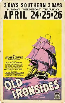 Old Ironsides is a 1926 American silent historical war film directed by James Cruze and starring Charles Farrell, Esther Ralston, Wallace Beery, and George Bancroft.[2] It was produced and distributed by Paramount Pictures.