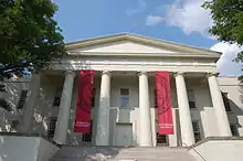 The academic side of campus lies to the East of North Broadway, one of the major streets in Lexington. Old Morrison is the central administration building. Designed by pioneer Kentucky architect Gideon Shryock and erected in 1833 under the supervision of Henry Clay (then professor of law at Transylvania), Old Morrison is the central image on the city seal of Lexington. It houses the offices of financial aid, accounting, the registrar, the president, the dean, communications, the Center for Academic and Professional Enrichment, and more. The building also holds the tomb of Constantine Rafinesque, professor of natural science at the university from 1819 to 1826, and Sauveur Francois Bonfils, who taught at the university from 1842 to 1849 (a native of France, he was forced to flee because of political discord).[15] During the Civil War, Old Morrison was a hospital for Union and Confederate soldiers.[16] It was gutted by fire in 1969 but was renovated and reopened in 1971. It was designated a National Historic Landmark in 1965 in recognition of the university's status as the oldest west of the Allegheny Mountains.[17]