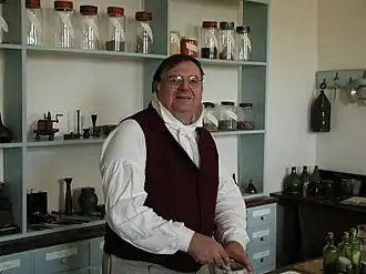 A museum interpreter explains aspects of a 19th-century apothecary in Old Salem