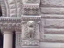These influences can be seen at Old City Hall with many of its many arches and towers. Also, the use of different-coloured stone contributes towards the Romanesque style of design. The exterior and interiors of Old City Hall are crafted with great detail. On the clock tower, four stone gargoyles were placed near the top of the tower. Near the building's entrance, there are several grotesque faces carved in stone. Lennox included his own likeness next to the other carved faces which, tradition has it, represent city councillors. Lennox's own face is identified as one of the caricatures by his handlebar moustache.[18]