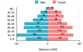 According to the 2002 Poland census, there were 1,961 people residing in Oleśnica village, of whom 50.2% were male and 49.8% were female. In the village, the population was spread out, with 28.5% under the age of 18, 38.6% from 18 to 44, 17% from 45 to 64, and 16% who were 65 years of age or older.[1]