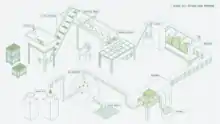 Olive presses were traditionally built within walled structures.[3] Traditional olive-presses consisted of a large, cylindrical millstone mounted by an upper milling-stone used to grind the olives and their pits into a pulp.[4][note 1] Formerly, the upper milling-stone was turned by a beast of burden pulling a wooden beam attached to the stone. After which, the pulp was collected and kneaded. It was then placed within frails (being no more than flexible, woven baskets made of thick fibrous material, usually of rushes, palm fronds, hemp or willow splints),[5][6] stacked one on top of the other, to which was applied a stone weight to release the oil from the pulp.[7] The extracted liquid which is obtained consists of oil and vegetable water (amurca) mixed together,[5] and runs off into a pit. After settling, the oil rises to the surface and is removed by way of decantation. Filtering the oil produces a clearer batch of oil. The olive residue that remained was used for lighting fires.