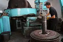 First the olives are ground into an olive paste using large millstones at a corporate oil mill. The olive paste generally stays under the stones for 30–40 minutes. This has three objectives: