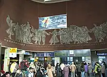 Capacity reasons led to the project of rebuilding and extending the station. A new functionalist building was finished in 1936, led by architect Antonín Parkmann. The current interior of the main hall came from 1960. Socialistically realistic sgraffito about size of 310 m2 is composed by the crowd of figures in local folk costumes (Haná) combined with socialistic features including ideological verses or picture of Sputnik. In 2009 a huge reconstruction of the station and the front space was finished to develop transport comfort. Accept new bus and tram terminal was also realized an underpass in the direction of Trocnovská and Trocnovská streets on the opposite way from the main entrance.