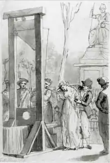 On 3 November 1793 the Revolutionary Tribunal sentenced her to death and she was executed for seditious behavior and attempting to reinstate the monarchy.[32] Olympe was executed only a month after Condorcet had been proscribed, and just three days after the Girondin leaders had been guillotined. Her body was disposed of in the Madeleine Cemetery.[33] Olympe's last moments were depicted by an anonymous Parisian who kept a chronicle of events: