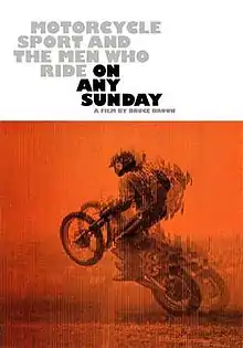 On Any Sunday is a 1971 American documentary film about motorcycle sport, directed by Bruce Brown. It was nominated for a 1972 Academy Award for Best Documentary Feature.[2][3] Brown tried to show the unique talents needed for the different forms of racing. For instance, the motocross riders were typically free-spirited types, while desert racers were often loners. In Grand National racing, Brown showed widely differing personalities, such as the business-like approach to racing displayed by Mert Lawwill versus the carefree approach that David Aldana became known for.[4]