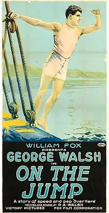 On the Jump is a 1918 American silent comedy film directed by Raoul Walsh and starring George Walsh, Frances Burnham and James A. Marcus.[1] A journalist resigns from a newspaper when it is taken over a pro-German sympathiser, and sets out to expose him as a German agent.