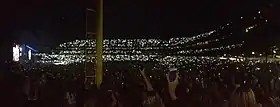 The following concerts for the duration of the tour were also met with high praise from critics: Merecedes J. Howze of New Pittsburgh Courier praised the "consistent" show in Cincinnati, stating "The duo has proven numerous times that their union, professionally and personally, is unstoppable." Howze concluded that the show was definitely a "couples concert" meant to be "enjoy[ed]" with a love partner.[51] CityBeat's Jac Kern, who attended the same show praised the duo for performing hard while fully using both of the two stages and interacting with the crowd. However she also felt that intimate moments between the couple on stage were "possibly staged".[52] The production of the tour was stated to be both large and minimal by The Boston Globe writer James Read who commented that only a few performers could manage to pull off a production of On The Run's scale. He continued his review, "Nor is there much to behold beyond its stars: no long catwalks, elaborate sets, or even a visible band. With Beyoncé and Jay-Z, two natural-born entertainers, you do not need much more."[53] Mesfin Fekadu of the Associated Press reported that the set list of the show emulated a conversation told through songs; he noted that despite the concert being a collaborative tour, "it was the performers' emotional solo material that made their presence as a collaborative duo strong and resilient".[54] The first Canadian show of the tour was again well received by critics. Graham Slaughter of the Toronto Star concluded in his review, "If there's anything to be learned from the On the Run tour, it's that tight timing, a dynamic storyline and legendary talent make a 42-song concert not just enjoyable, but rather unforgettable. Performers be warned: the bar on dual concerts has forever been raised."[55] Lorraine Ali of the Los Angeles Times who attended the first of two shows in Pasadena, California, also gave a positive review noting that the concert showcased how a marriage should work with the spouses "balancing out each other's weaknesses with individual strengths" on stage. Ali went on praising the stage interactions between the pair such as kissing and toggling and concluded, "Whether it was a carefully orchestrated act or not, they are a great team."[56]