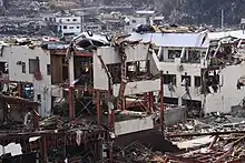 Onagawa was one of the most heavily damaged communities by the 11 March 2011 Tōhoku earthquake and tsunami. The tsunami reached in excess of 15 metres (49 ft) in height and swept 1 kilometre (0.62 mi) inland, claiming 827 lives and destroying 70% of the buildings in the town.[9][10] At least 12 of the town's 25 designated evacuation sites were inundated by the tsunami. The town's hospital located on a hill was extensively flooded on the first floor at the maximum recorded wave height of 18 meters. Six reinforced concrete buildings in the town of up to 4 stories in height were overturned by the force of the surging water and debris and Onagawa Station and its nearby railway tracks were also destroyed.[11]