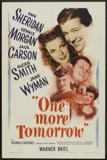 One More Tomorrow is a 1946 American drama film directed by Peter Godfrey and written by Charles Hoffman and Catherine Turney (additional dialogue by Julius J. Epstein and Philip G. Epstein) from the play The Animal Kingdom by Philip Barry. The film, starring Ann Sheridan, Dennis Morgan, Jack Carson, Alexis Smith, Jane Wyman and Reginald Gardiner, is a remake of the 1932 film The Animal Kingdom. It was released by Warner Bros. on June 1, 1946.[2][3]
