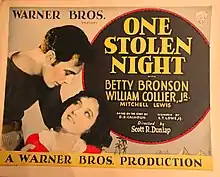 One Stolen Night is a 1929 American part-talkie adventure crime film directed by Scott R. Dunlap, and starring Betty Bronson, William Collier Jr., Mitchell Lewis, Harry Todd, and Charles Hill Mailes. It is based on the short story The Arab by D. D. Calhoun. It is a remake of the 1923 film with the same name. The film was released by Warner Bros. on March 16, 1929.[2][3][4]