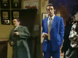 Del's nemesis from his school days, corrupt policeman Roy Slater (played by Jim Broadbent), made three appearances, in "May The Force Be With You", "To Hull and Back" and "Class of '62".[55] Feared local villains, Danny and Tony Driscoll (Roy Marsden and Christopher Ryan, respectively) featured once, in "Little Problems", but were mentioned in two previous episodes ("Video Nasty" and "The Frog's Legacy"),[56] and are important in the story of The Green Green Grass.[57] An adult Damien (Douglas Hodge) appeared in "Heroes and Villains".[58] Rodney and Mickey's friends, the smooth-talking Jevon (Steven Woodcock) and then, briefly, Chris (Tony Marshall), a ladies' hairdresser, featured sporadically during the sixth and seventh series and the intervening Christmas specials.[59] The two-part 1991 Christmas special, "Miami Twice", saw Richard Branson and Barry Gibb make cameo appearances.[60] Mike Read appeared as himself, hosting an episode of Top Of The Pops, in "It's Only Rock and Roll" and Jonathan Ross appeared as himself in "If They Could See Us Now".[61][6]