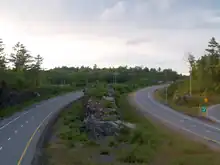 Within Barrie, Highway 400 passes through a trench which places it below grade for most of its length,[8] the route curving around downtown Barrie towards the north-east.[9] On the outskirts of Barrie, the through right-of-way continues as Highway 11 towards Orillia and North Bay, while Highway 400 exits and veers 90 degrees to the north-west towards Georgian Bay, travelling alongside the former Highway 93 to Craighurst.[11] At Craighurst the highway again turns north-east, skirting the Copeland Forest and the ski hills of the Oro Moraine, to meet Highway 12, which runs concurrently with the 400 between Exits 141 and 147, in Coldwater.[11] From here, the highway takes on the Trans-Canada Highway designation, and follows a predominantly north-western heading along what was the route of Highway 69, toward the planned terminus of Sudbury.[12] In Muskoka and Parry Sound Districts, Highway 400 is in most sections a twinned four-lane highway,[8] but several bypasses have and are being built to circumvent the communities along the way.[12][13] At Port Severn, the highway meets the rugged Canadian Shield, and winds its way north through the granite, often flanked by towering slabs of rock.[8]