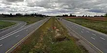 East of the Murphy Road underpass, the freeway curves to the northeast to bypass its original alignment.[11] It crosses the Howard Watson Nature Trail, a mixed-use recreational trail that was converted from a Canadian National Railway (CNR) line in 1988.[12] The highway curves back to its east–west orientation at an interchange with Highway 40 (Modeland Road).[11] It passes south of Sarnia Chris Hadfield Airport before exiting the city limits at Mandaumin Road (Lambton Road 26).[13]