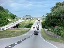 In 1975, construction began on a westward extension of the Brantford Bypass, from Highway 2 (Paris Road) to Rest Acres Road, which would become Highway 24. This work consisted of the twin bridges over the Grand River and an interchange at Rest Acres Road. The Canadian National Railway underpass west of Highway 2 was built by the railway.[23] By the beginning of 1978, this work was completed.[49] Work resumed west of Highway 24 in early 1982 to connect with Highway 401 near Woodstock to relieve the high traffic volumes along Highway 2.[50] This included interchanges at Brant County Road 25 and Highway 53.[40] A section from Highway 24 to County Road 25 was opened in November 1984,[24] followed by the section west of there to Highway 53 one year later.[51] Construction of the gap between Highway 53 and Highway 401 began in late 1985,[52] followed by the Highway 401 overpass for the westbound lanes, which began in 1987.[16] Transportation minister Ed Fulton ceremoniously opened the new freeway connection on September 26, 1988, completing the Woodstock to Brantford link.[24]